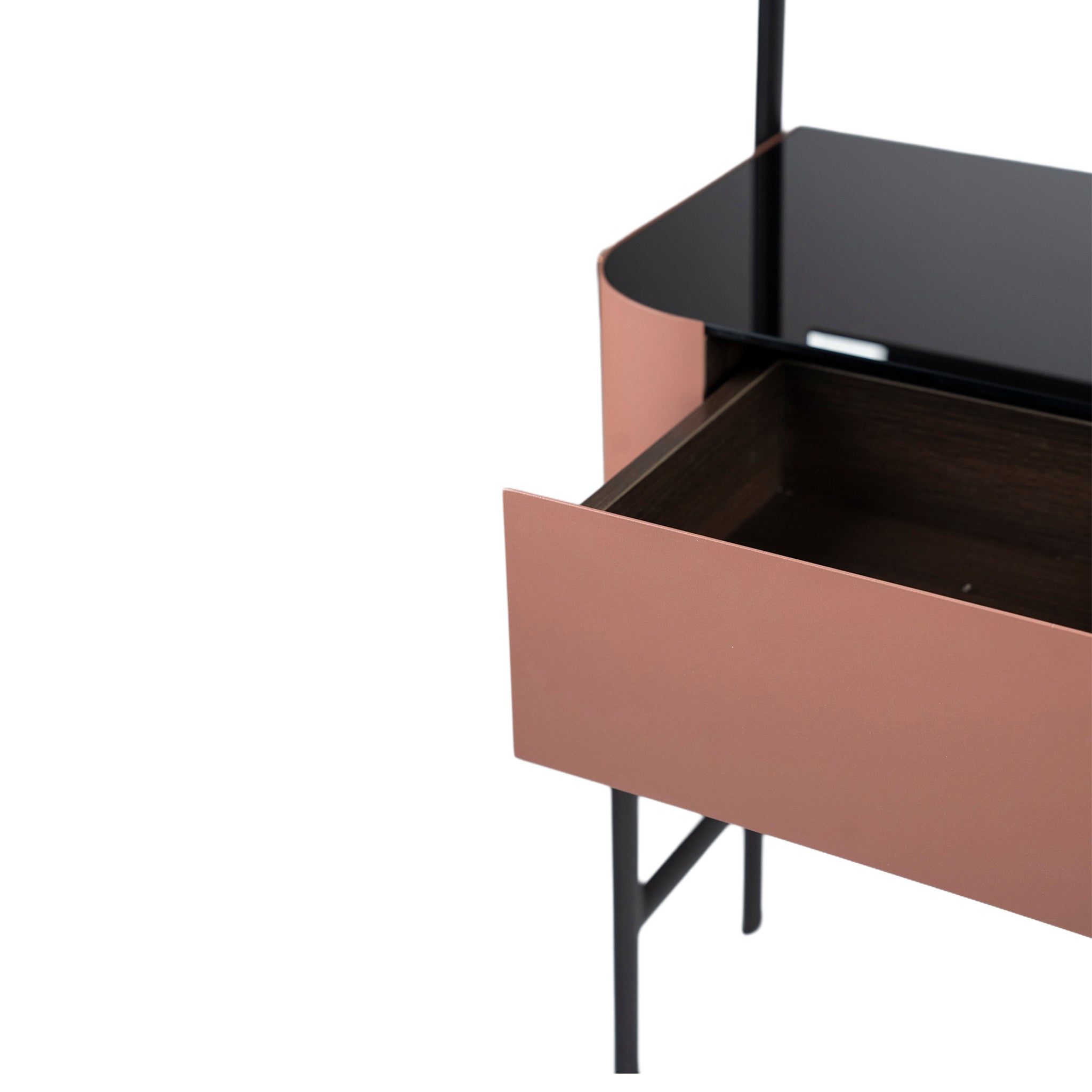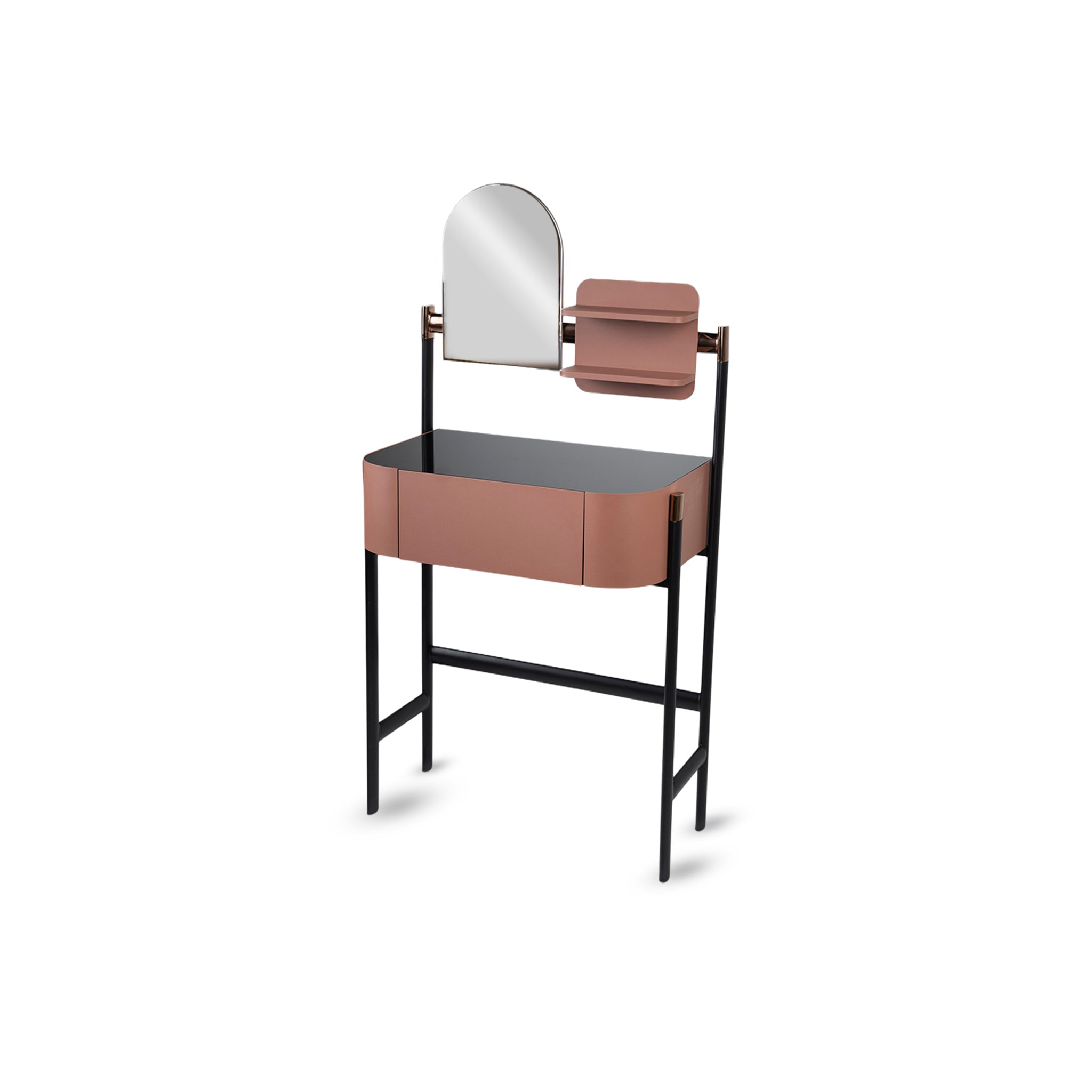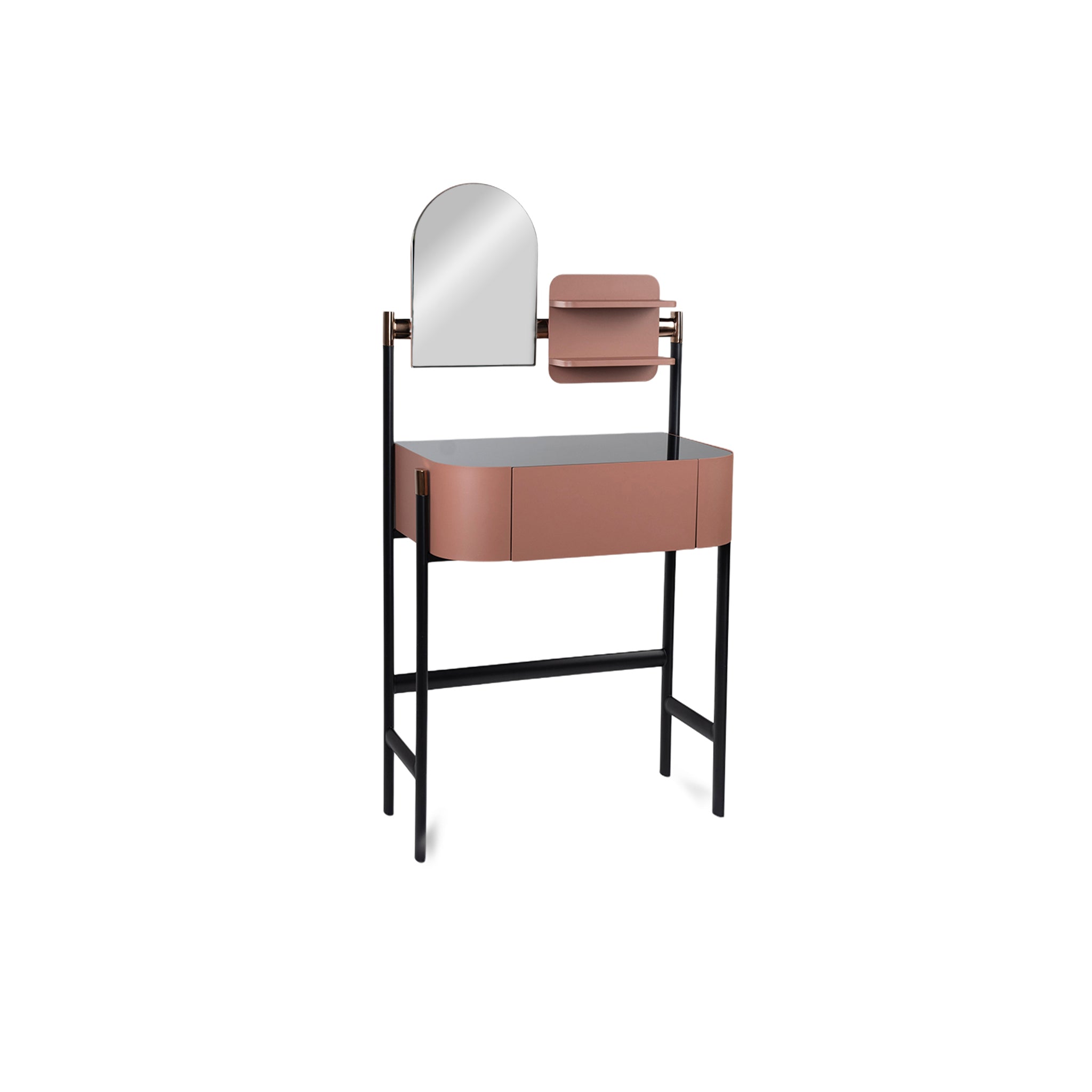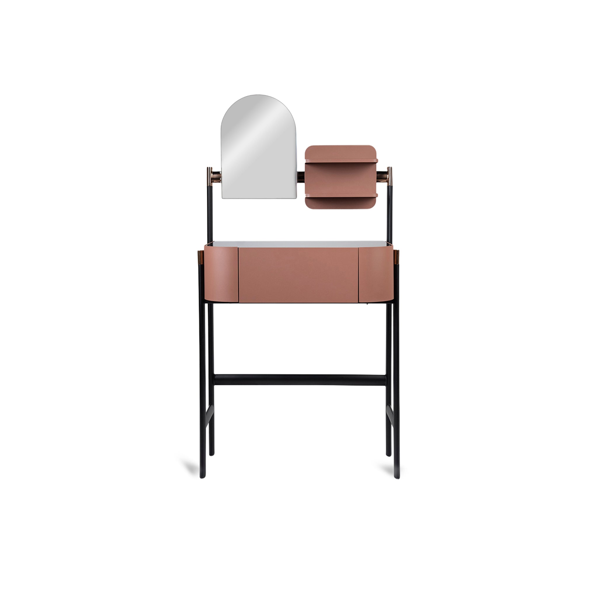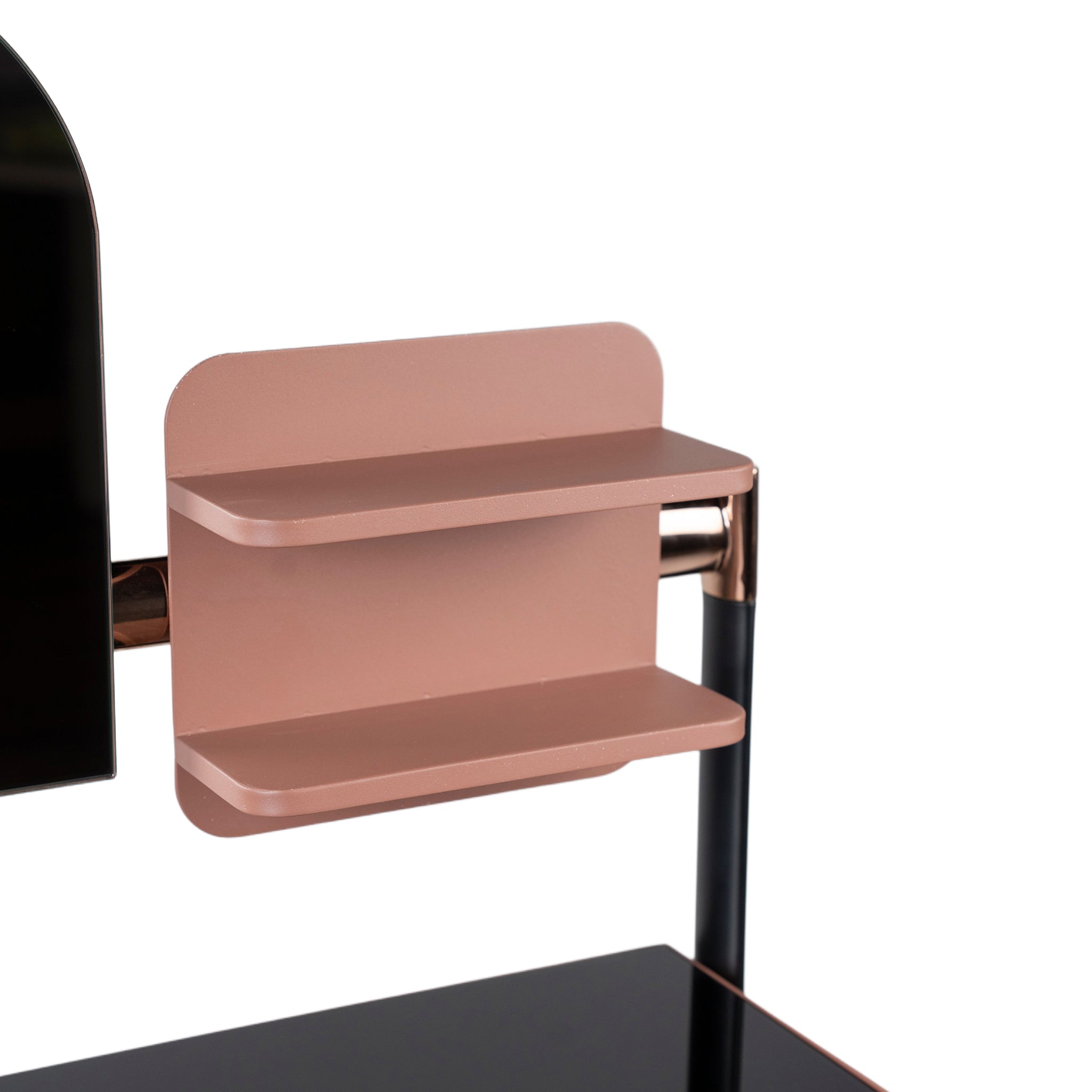 طاولة تزيين أطفال عصرية ومرحة، بقاعدة بلون الصدأ وأدراج دائرية ناعمة، مدعومة بإطار أسود متين. تعلوها مرآة منحنية واحدة، تضفي لمسةً من الأناقة والعملية، مثالية لإلهام إبداع طفلك.