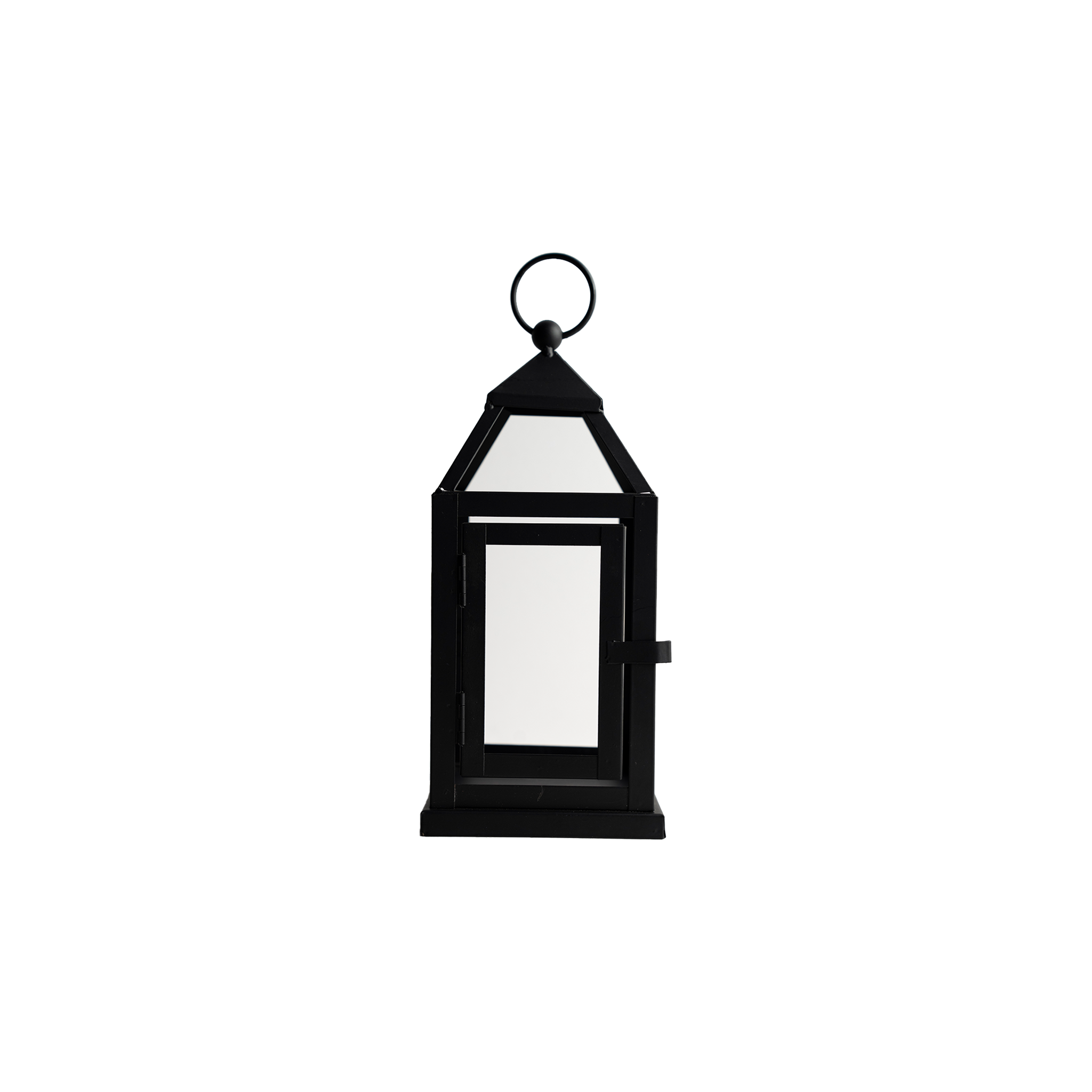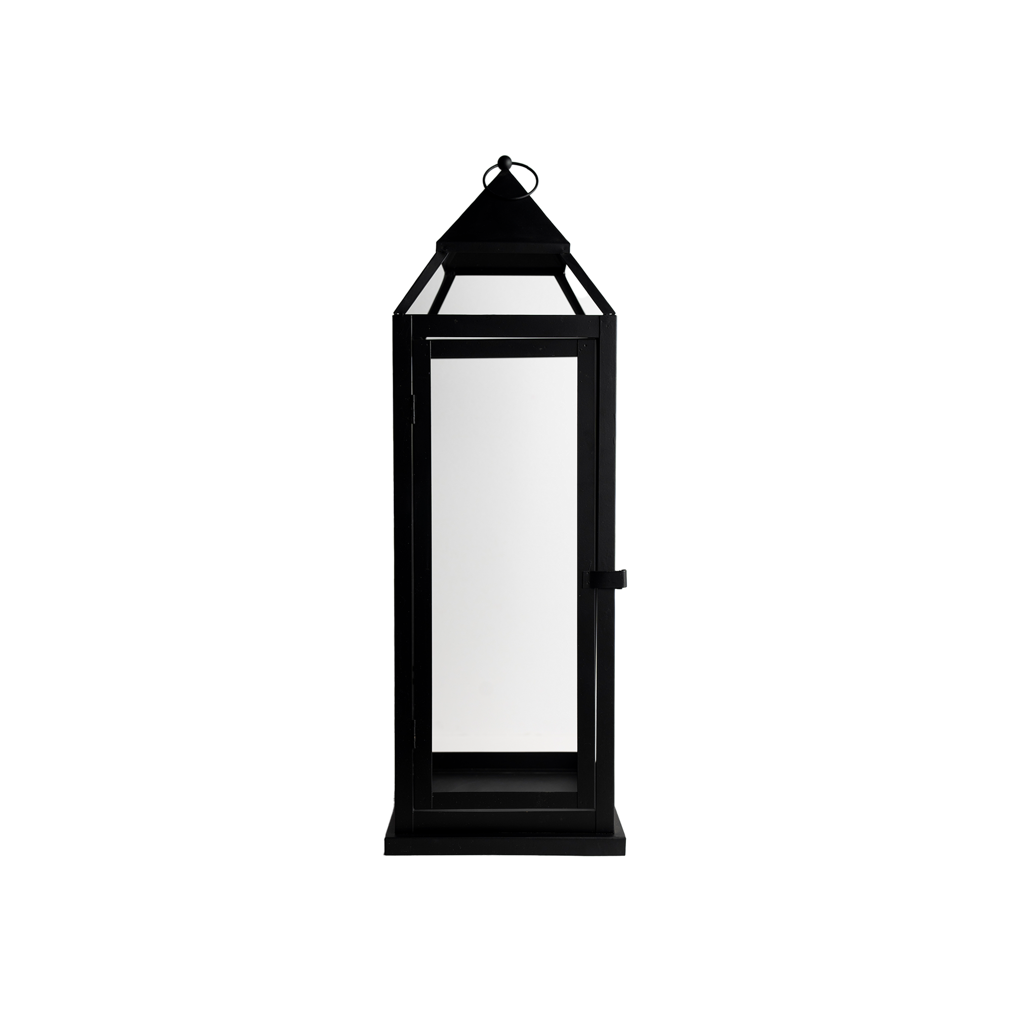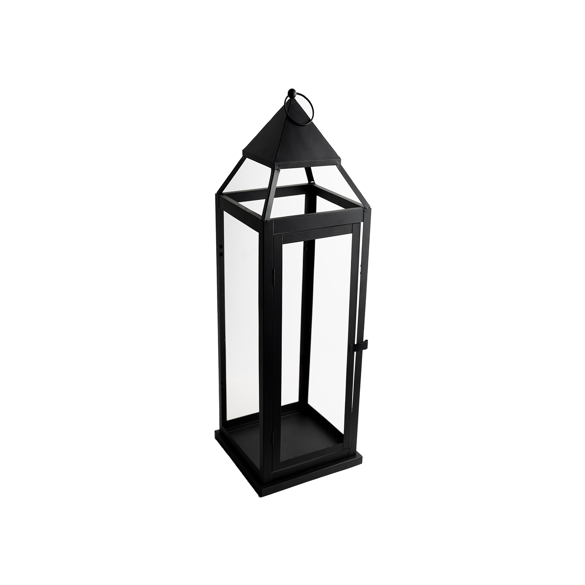 يتميز فانوس معدني أسود بتصميم عصري أنيق، مع ألواح زجاجية وإطار معدني متين. يسمح هيكله المفتوح بدخول ضوء الشموع الناعم، مما يخلق أجواءً دافئة ومريحة. مثالي للأماكن الداخلية والخارجية.