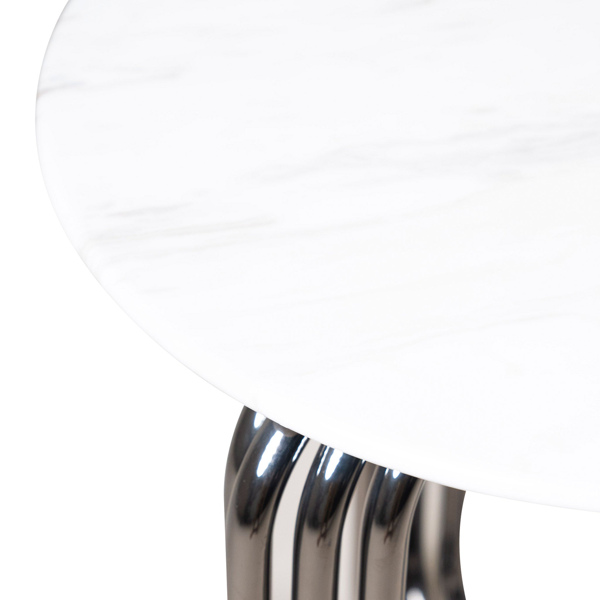 Keri side table with a marble slab top and stainless steel legs.