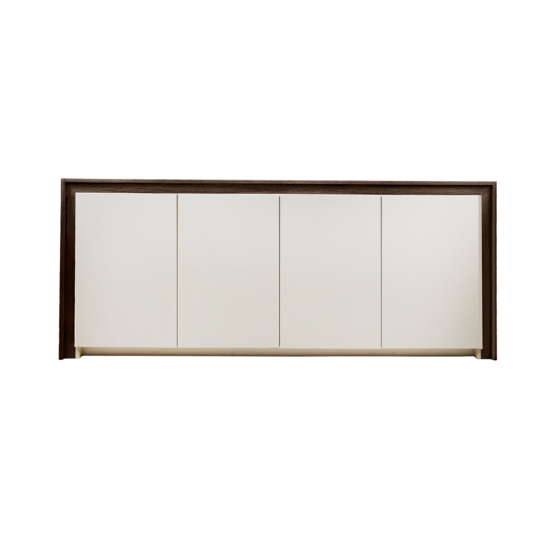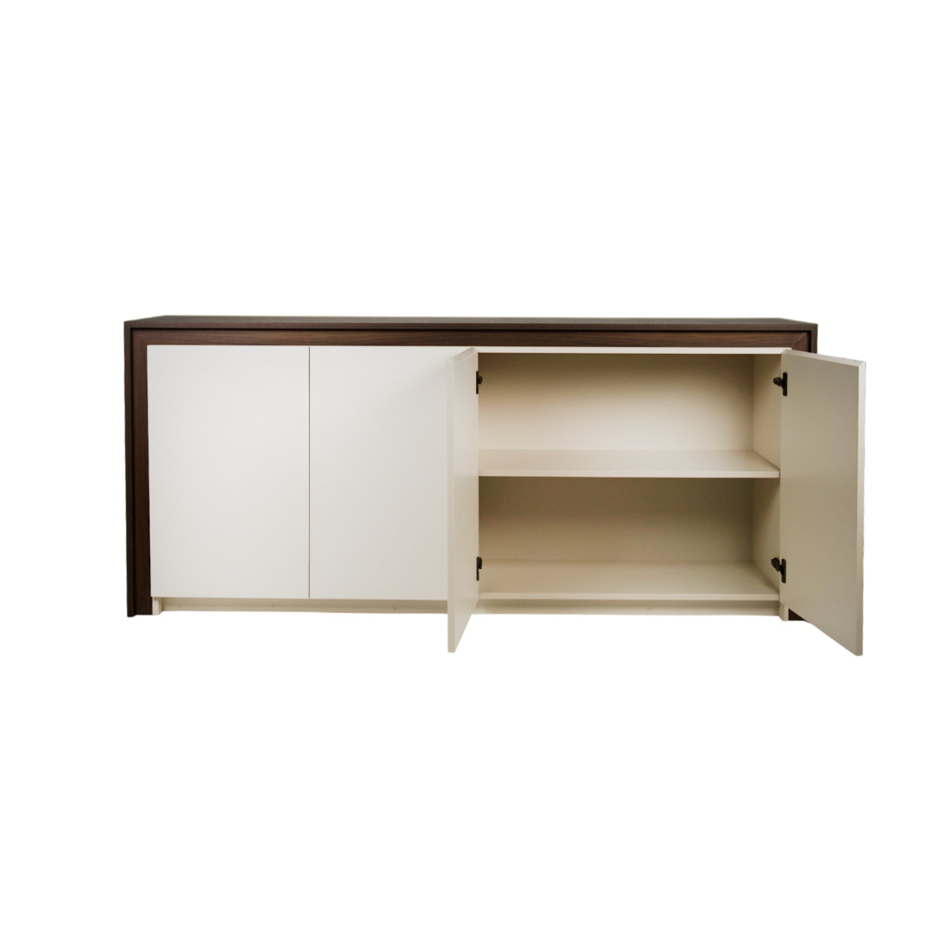 A modern buffet with a contemporary design and dark wood color, offers ample storage space with a stylish look that suits various home decors.