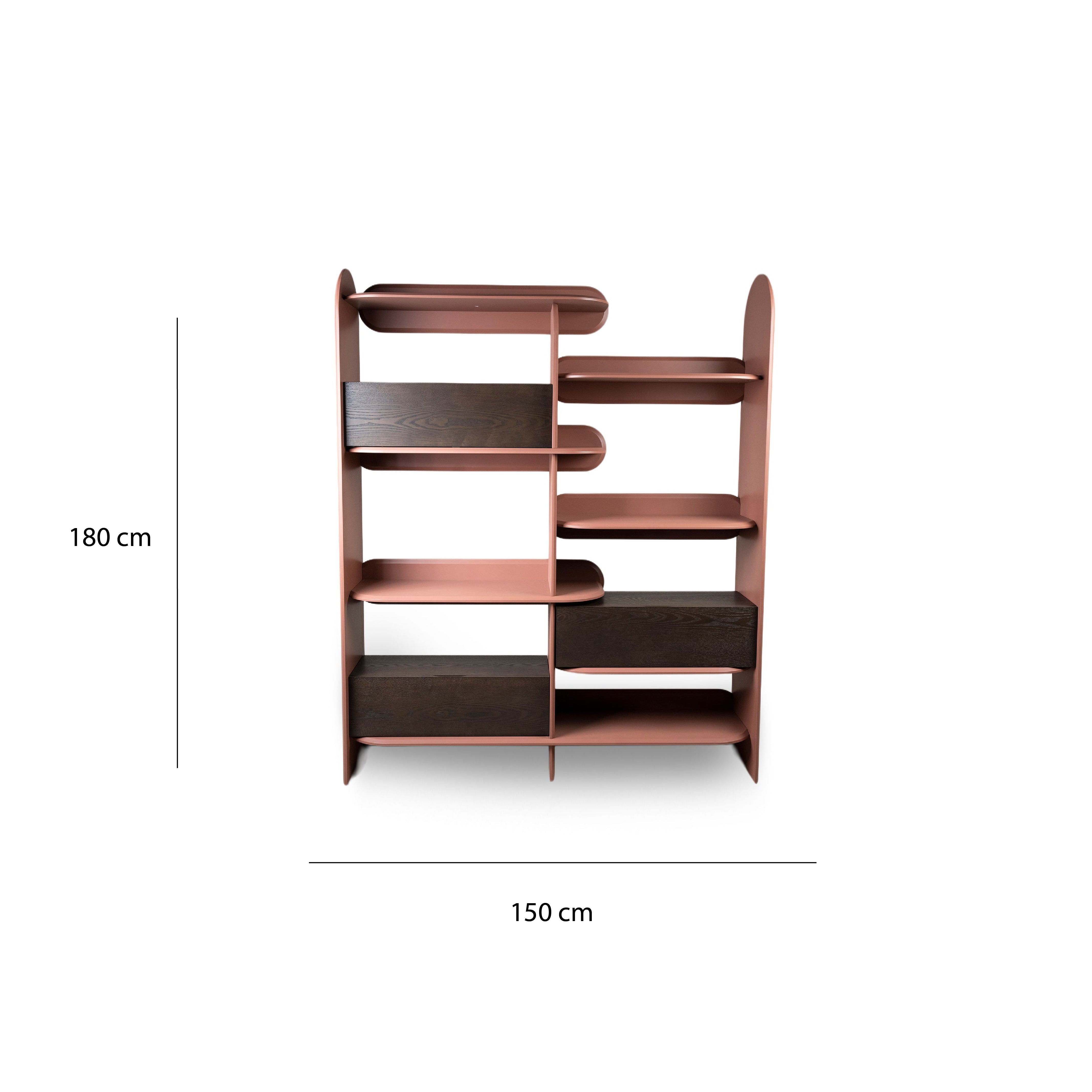 Sculptural bookshelf crafted from curved wooden pieces, open flowing design ideal for books or décor. Color: Dark ash / Ochre red.