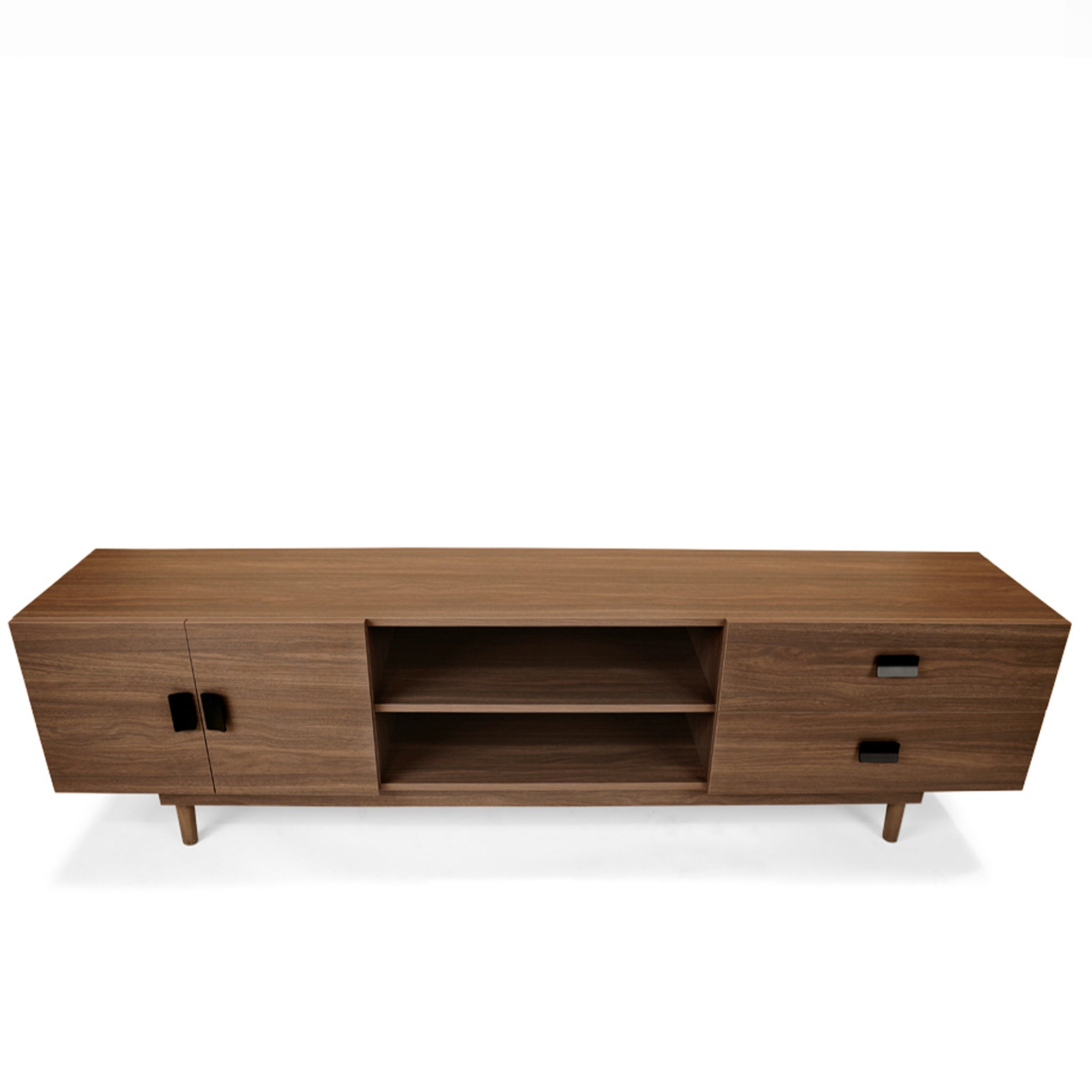 A modern TV unit made of high-quality wood with handles for a luxurious touch. It has ample storage space consisting of two drawers, two shelves, and a cabinet, making it ideal for easily organizing your devices.